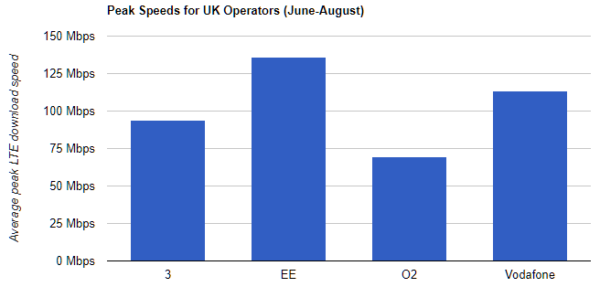 In our U.K. report, EE had the fastest average LTE speeds, and it turns out it has the highest peak speeds of 136.1 Mbps in our tests. What this means is EE has a very powerful, high-capacity LTE network, and that power is reflected in the typical 4G connection it supplies to its customers on an everyday basis. The surprise, though, is the operator that had the second highest peak speed in our analysis.