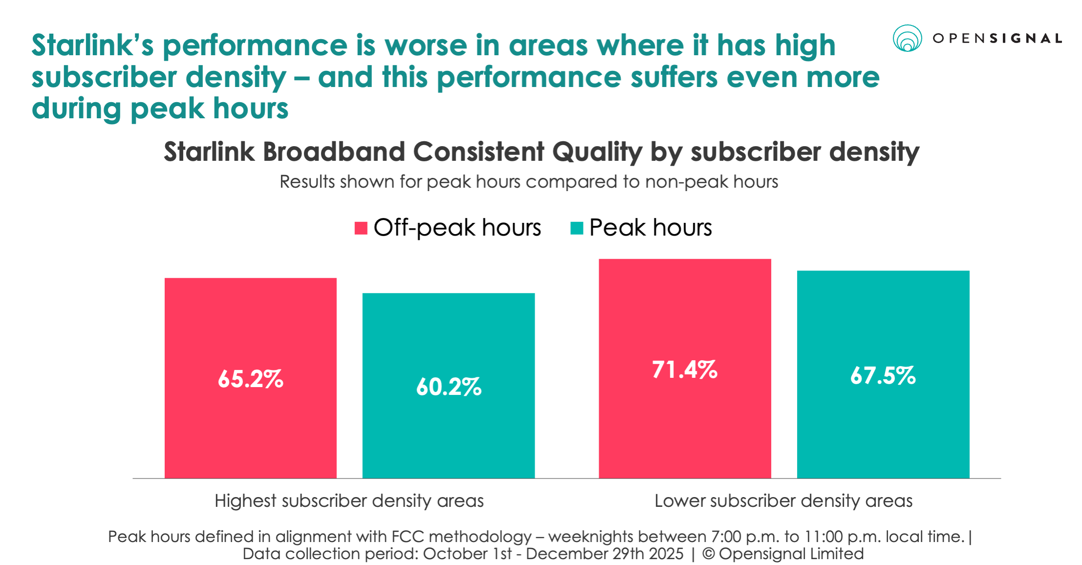 In our analysis, Broadband Consistent Quality is notably worse in the areas where we see the highest density of Starlink subscribers than in less dense areas. It also shows a greater decline in performance during peak hours. At worst, during peak hours, this leads to an experience that only meets subscriber’s needs for common applications 60.2% of the time. This is the defining constraint of Starlink: as adoption increases in a specific concentrated area, performance declines — limiting its ability to scale without degrading user experience.