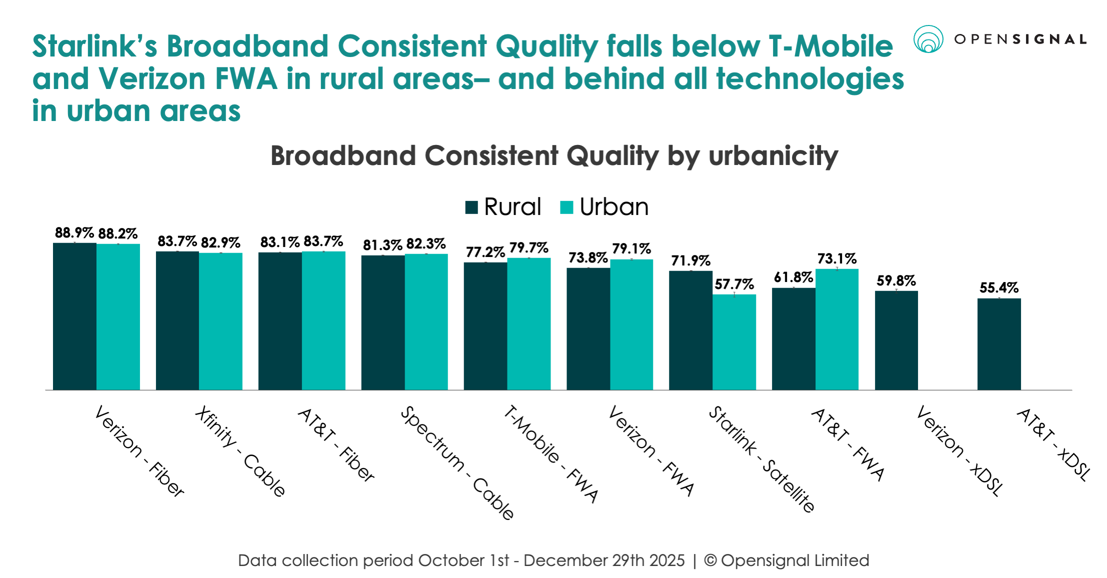 Fiber and cable providers deliver the strongest Broadband Consistent Quality performance, with very similar performance in both urban and rural areas. Meanwhile Starlink places slightly below both T-Mobile and Verizon’s FWA services in rural areas. In urban areas, it struggles – placing significantly below all three telcos’ FWA services in urban areas.