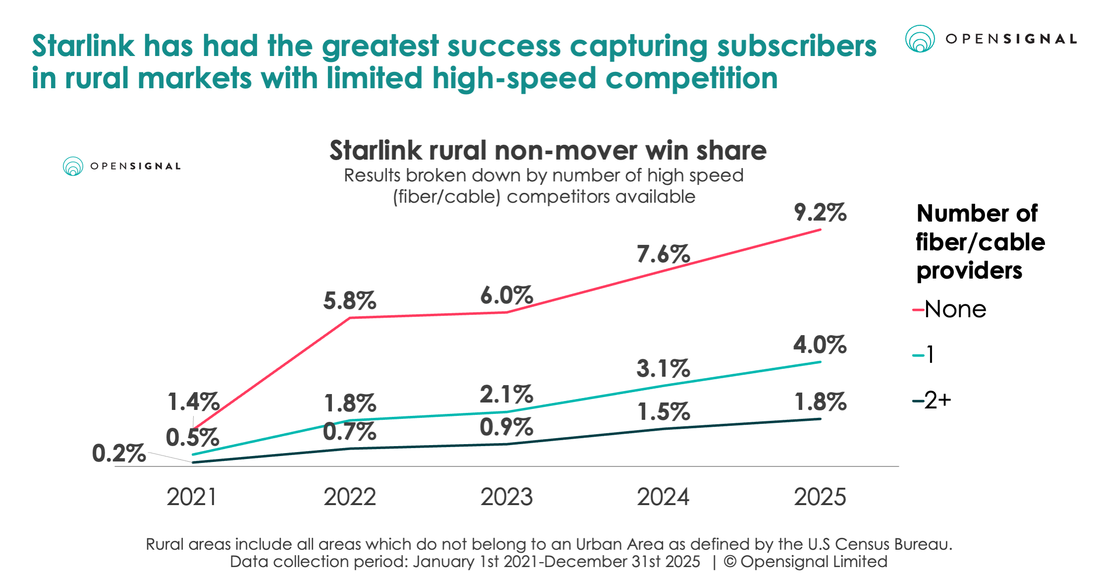 Starlink’s proximity to FWA in this performance table raises an interesting question: Is Starlink following the same trajectory as FWA? Certainly there are similarities, especially in market approach. Like initial FWA offerings, Starlink is prioritizing targeted market approaches, aggressive pricing and “good enough” performance – and this is driving market growth. At the moment, the main place we see this growth is in rural locations where competition is limited. We measure this using win share, looking at the switchers that choose Starlink. For the fairest comparison, we limit this to “non-movers” – or people who stayed at their existing address but changed their broadband provider.
